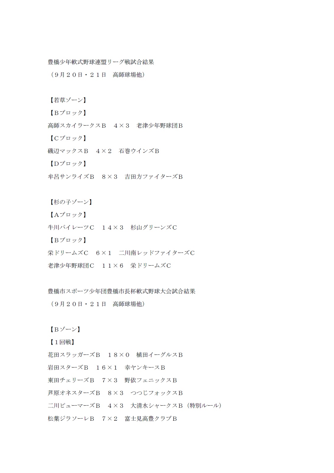 9月20日・21日リーグ戦・スポ少市長杯試合結果