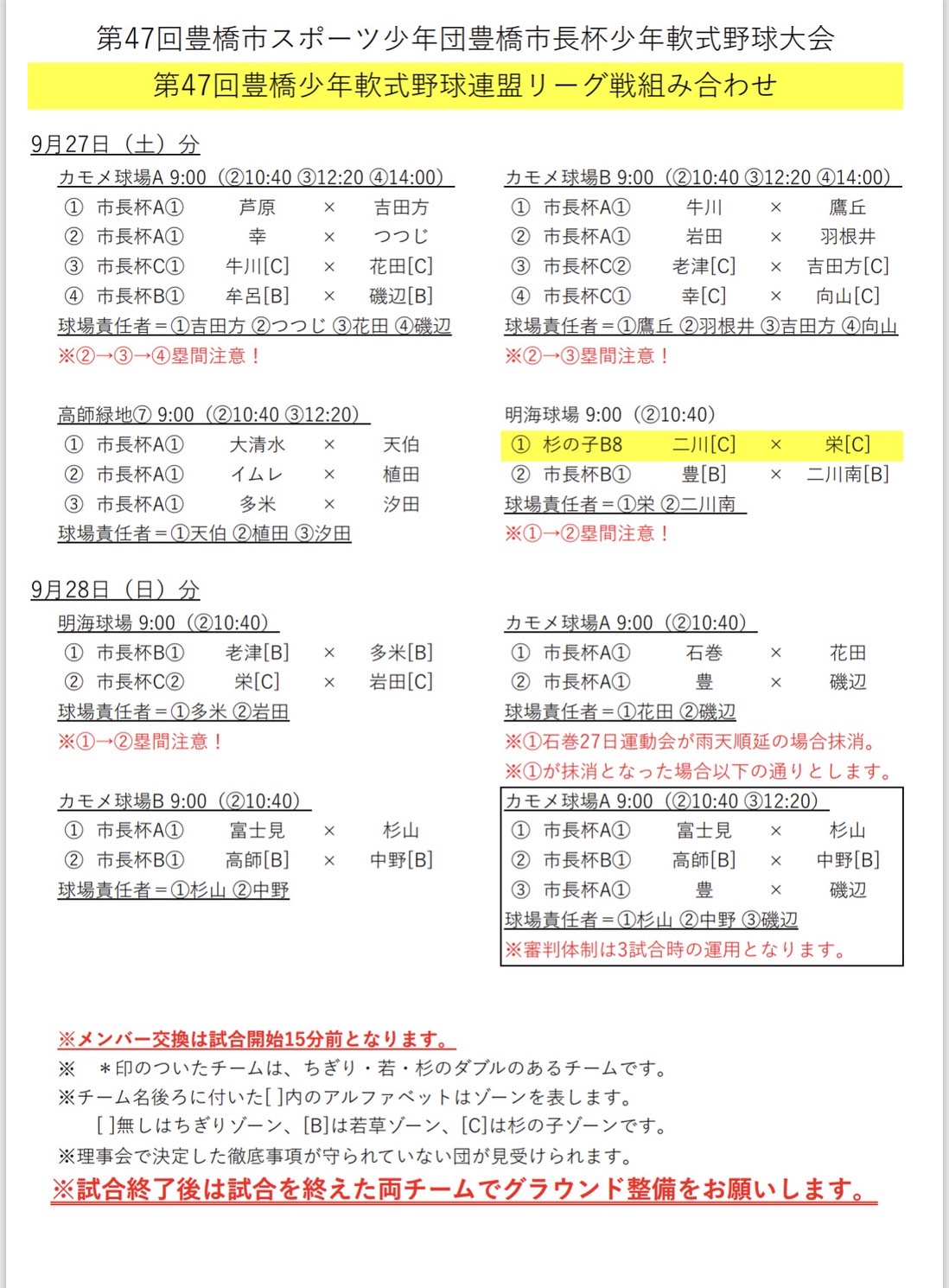 9月27日・28日リーグ戦・市長杯組み合わせ