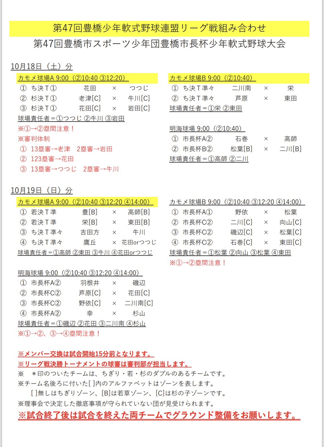10月18日・19日リーグ戦・市長杯組み合わせ